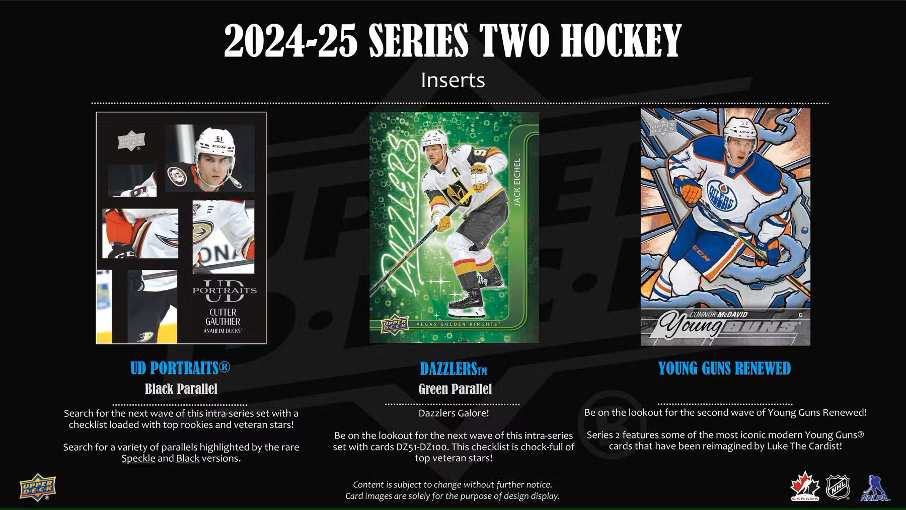 Series 2 sports the next 250 cards of the 2024-25 Upper Deck Base Set. Annually, the Upper Deck Base Set is the most widely-collected Base Set in hockey. It includes 198 veteran cards, 49 Young Guns rookie cards and three checklist cards. The iconic Young Guns are the most anticipated rookie cards of the season.