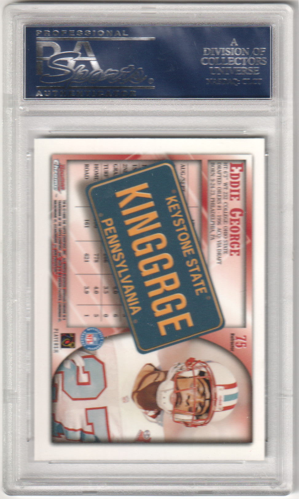- You are purchasing a 1998 Bowman Chrome Eddie George #75 Interstate Refractor PSA 10. You will receive the exact item in the photographs. Thank you for looking. About Columbia Hobby: Columbia Hobby is a premier full service hobby shop in the Pacific Northwest for over 25 years. Please visit our shop just across the river from Portland OR if you are ever in town. We are actively buying cards as well as offering a consignment service for your higher end pieces. We are also have largest card supplies retailer and manufacturer on the West Coast. NOBODY has sold more toploaders over the past 5 years then Columbia! We are happy to combine shipping. Charges are $.25 s/h for each additional card after the first card purchased. Please wait for a combined invoice before paying in order to take advantage of this combined rate. Columbia Hobby is a family run business that actively supports autism charities and our local community. Thank you for giving us the opportunity serve our friends in need. We couldn't do this without you! About Us Columbia Hobby has been a family owned and trusted business since 1998. We strive to run a honest and ethical company that will not cut corners or cheat to make a sale. Our company supports families dealing with autism and you can feel good knowing that you are helping to support such a need. Thank you for making us the unquestioned online leader in collectible supplies and memorability display cases for the past 18+ years and we look forward to serving you for many more years to come. Listed With Mascot.